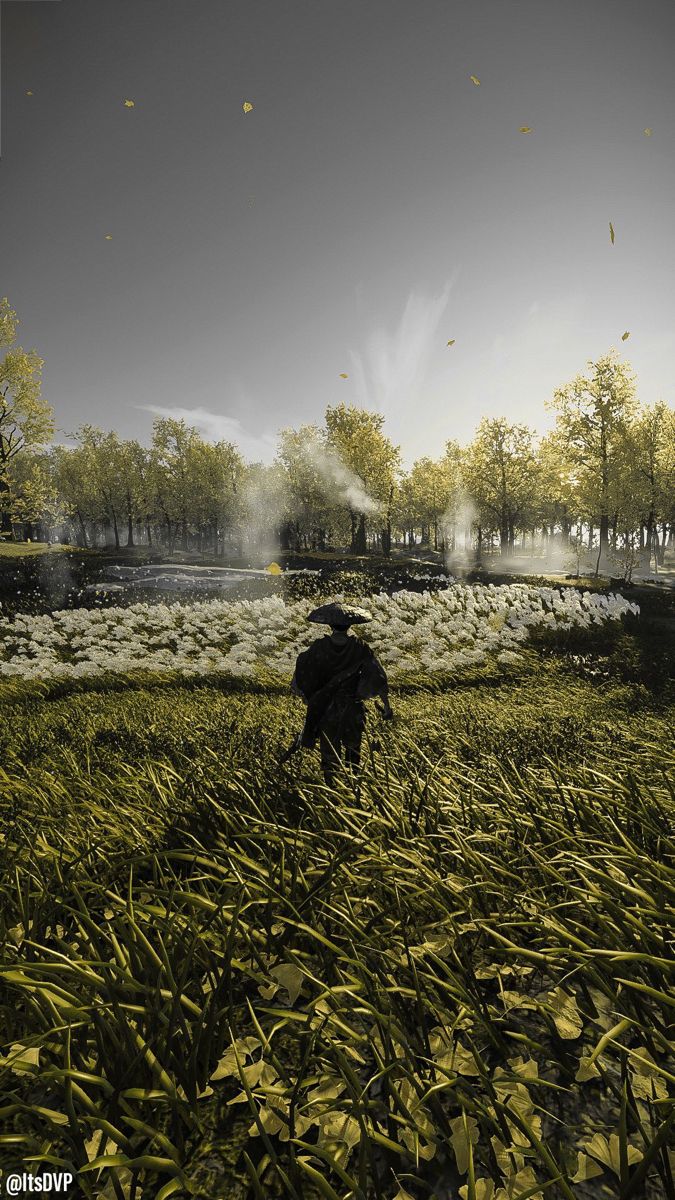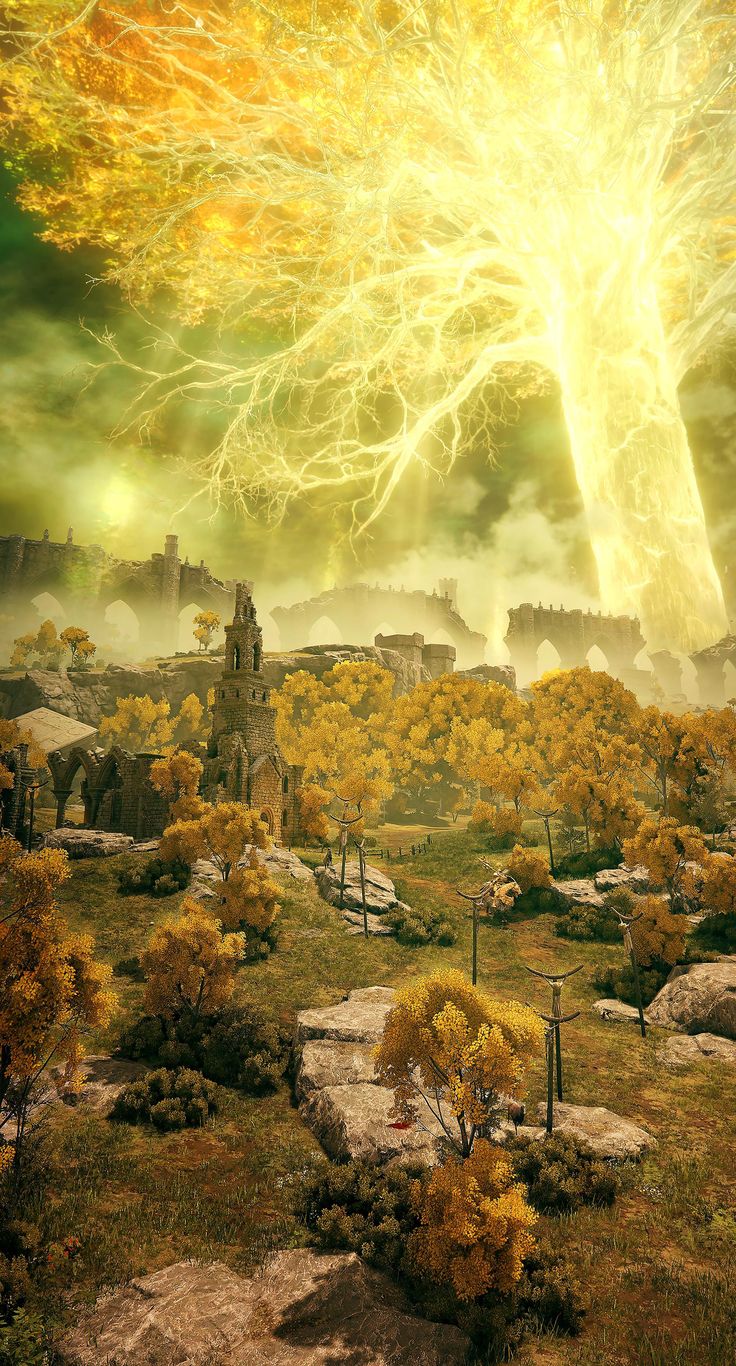 What is the scenery of this image? Here we can see an animation of a forest. In the foreground there are rocks, trees and plants on ground with green leaves. Behind it's looking like buildings or houses which is made up of bricks at top right side corner of picture where light colored something seems happening over here such as lighting effect might be present under these objects where tree trunk appears yellow color from bottom towards middle its looks redish orange colour while other branches appear yellowish brown all around them after that. |